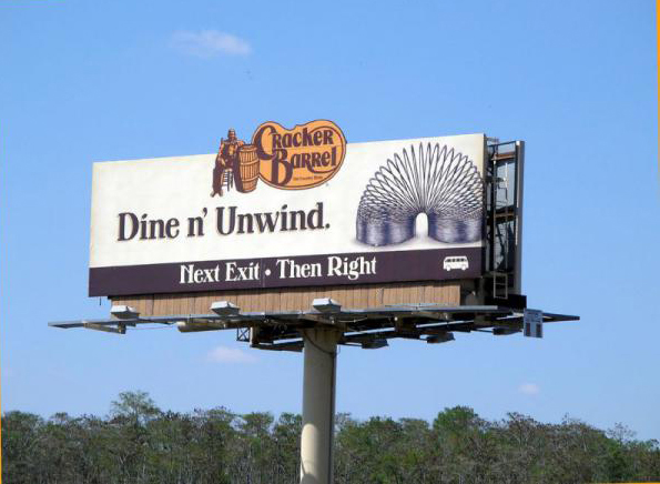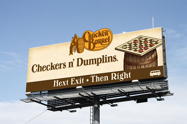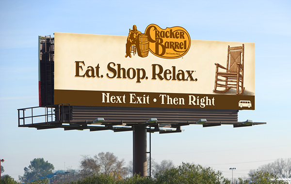 Cracker Barrel solidified a spot in history by developing an aggregating technology in the early days of OOH. They created the service to support their singular strategy of securing the billboards in closest proximity to their stores, and it has since grown into a full operational agency. From a creative standpoint, Cracker Barrel is legendary for signs that make you crave a bite to eat and stretch your legs as you hit the road for business or pleasure. A perfect mix of the classic functionality and contemporary promotion.